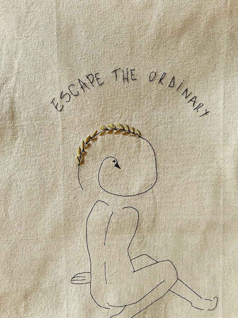 O Canvas Escape the Ordinary é uma peça artesanal minimalista que combina delicadeza e profundidade em sua composição. Feito em tecido cru, este canvas apresenta o bordado de uma figura feminina com traços simples e elegantes, adornada por uma coroa de ramos em dourado.