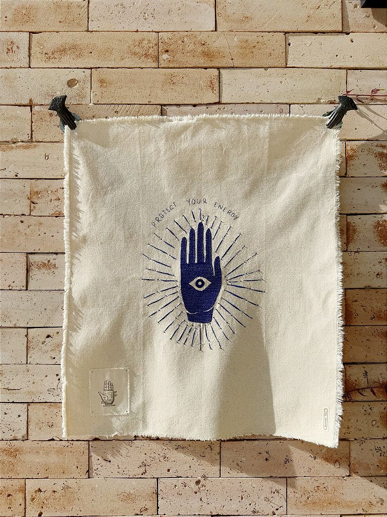 O Canvas Protect Your Energy é uma peça artesanal com um design minimalista e profundamente simbólico. Feito em tecido cru, apresenta um bordado de uma mão estilizada com um olho central, cercado por raios que remetem à proteção e ao equilíbrio energético.