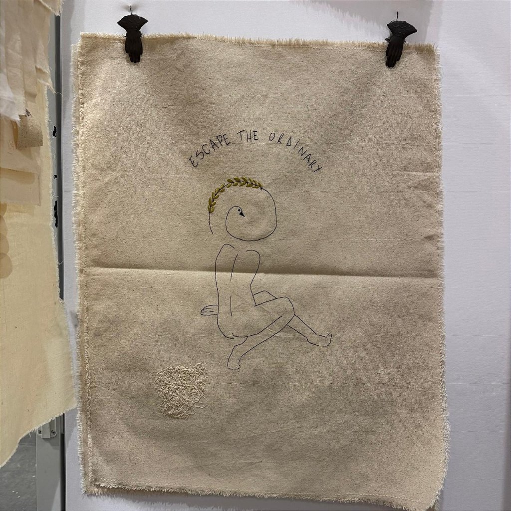 A composição inclui uma leve silhueta feminina bordada, adornada com uma coroa de ramos dourados, simbolizando força e leveza. O elemento de destaque é a frase bordada “Escape the Ordinary”, que sugere reflexão e inspiração para se afastar do comum e abraçar o extraordinário no cotidiano.