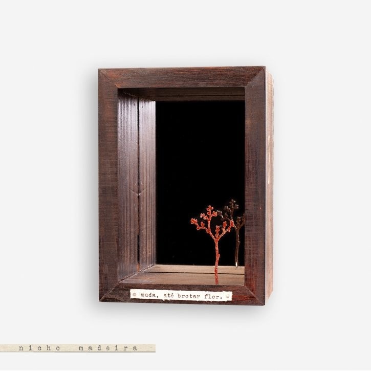 Um nicho de madeira espelhado pode pazer uma diferença na montagem da sua parede. Escapando do comum. Contém uma escultura de ferro no formato de árvore.