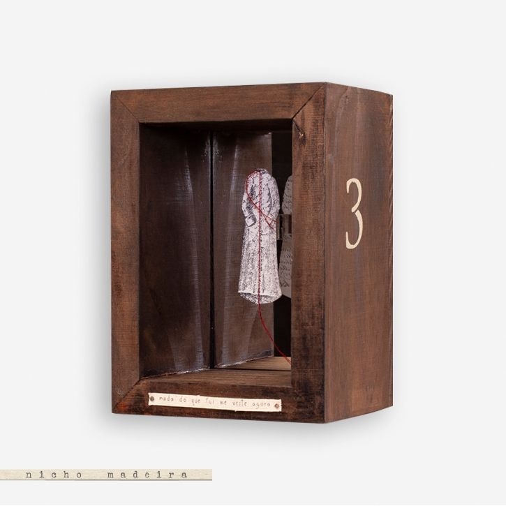Um nicho de madeira espelhado pode pazer uma diferença na montagem da sua parede. Contém uma escultura interna.