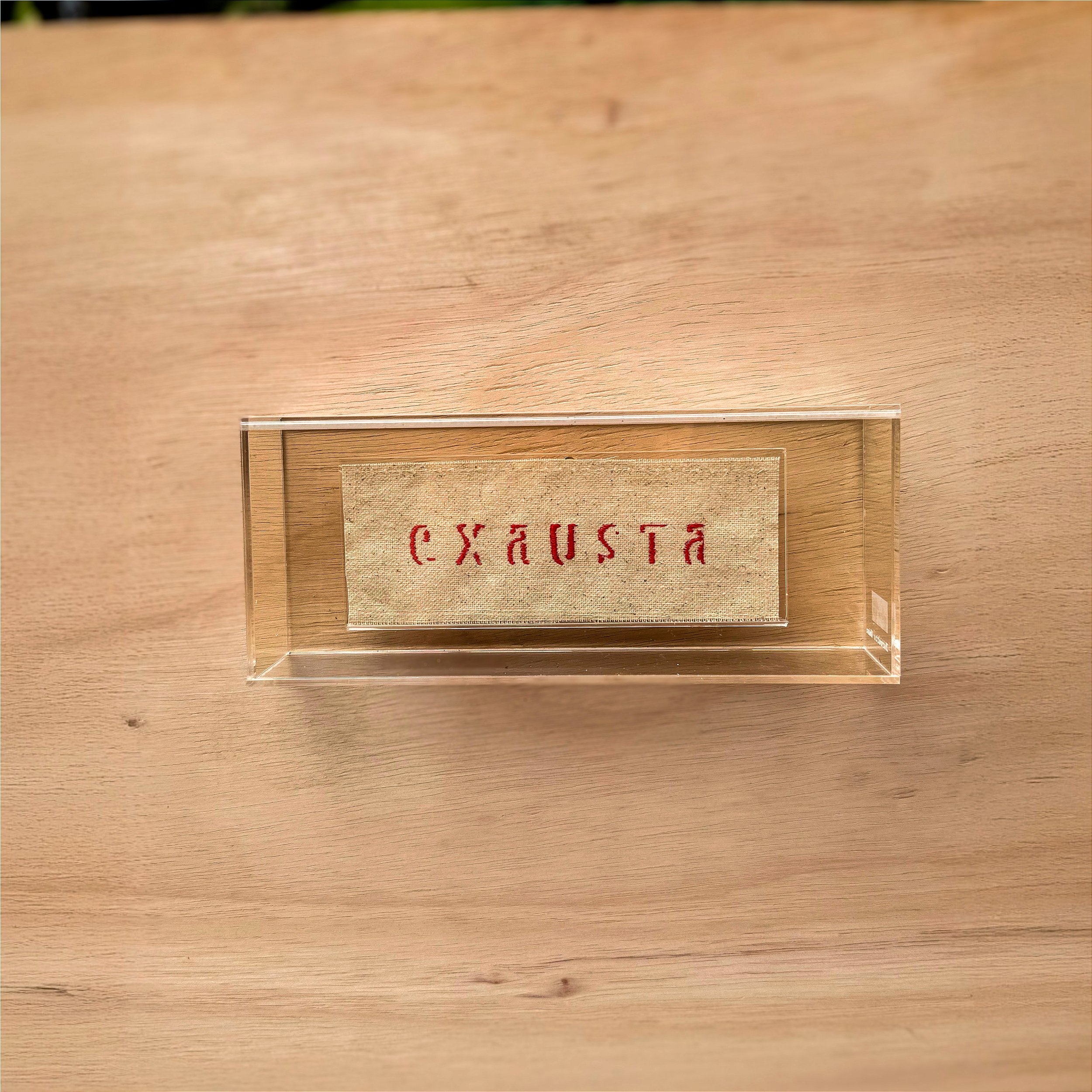 Com o termo “Exausta” bordado à mão em vermelho sobre tecido cru, a peça é um gesto de vulnerabilidade e autoescuta.
