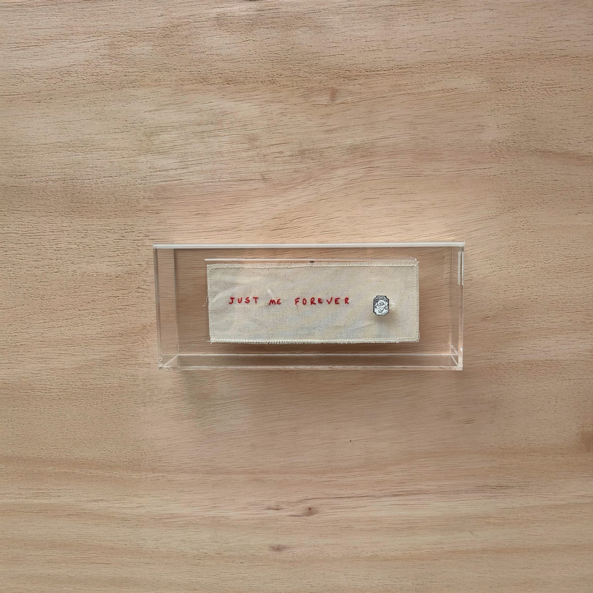 Confeccionada sobre uma base de tecido cru, que confere uma textura natural e acolhedora, a arte apresenta a poderosa frase "Just me, forever" bordada com fios vermelhos vibrantes. Essa mensagem central destaca a força da individualidade e a constante celebração de si mesmo, um lembrete diário do seu valor. Um pequeno elemento bordado ao lado, remetendo a um rosto estilizado, adiciona um toque singular e poético, complementando a mensagem de autoafirmação.