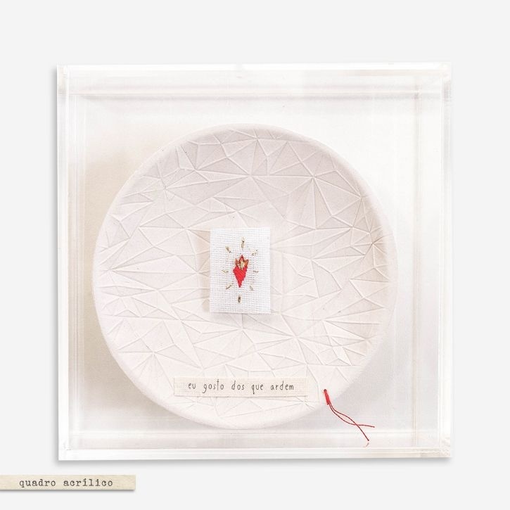Um quadro feito com um prato em papel machê, um coração bordado e moldura em acrílico.