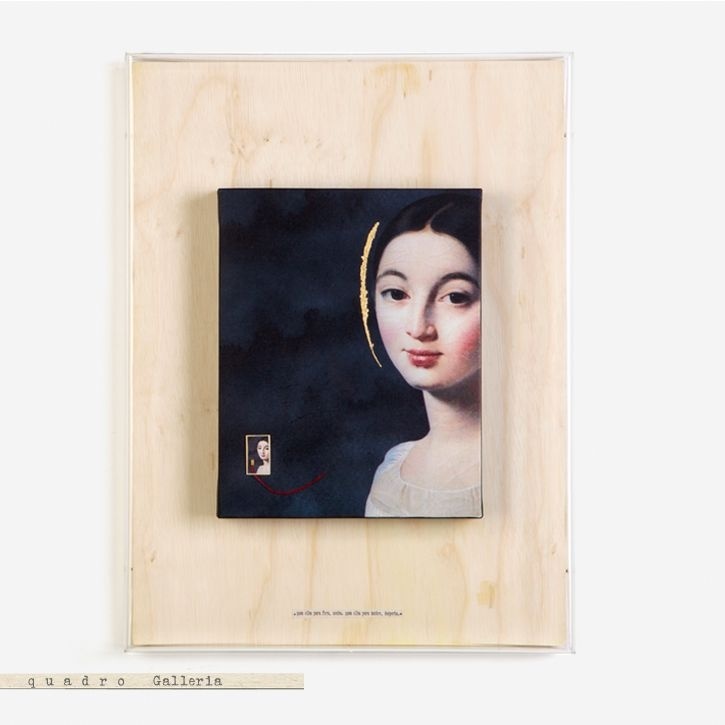 Uma peça altamente especial. Tela com colagem emoldurada em base de madeira e acrílico.