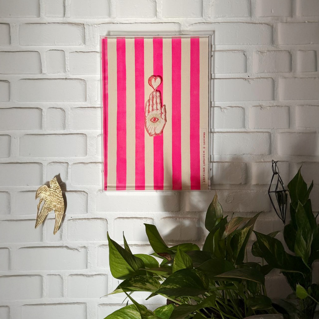 O quadro se destaca por seu design marcante: um fundo listrado verticalmente em um rosa choque intenso (ou fúcsia vibrante) e um suave tom de bege/off-white. Essa combinação cria um efeito visual moderno e alegre, capaz de revitalizar qualquer ambiente. No centro, uma delicada e estilizada ilustração de uma mão aberta com um olho místico centralizado na palma, e um pequeno coração flutuando acima, evoca intuição, proteção, amor e a busca pelo propósito. A mensagem "ESCOLHAS CONDUZEM O CAMINHO", discretamente posicionada na lateral, serve como um lembrete diário do poder de suas decisões e de sua jornada pessoal.