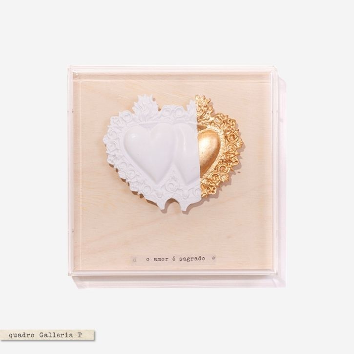 O quadro “Sagrado Coração Duplo” traz a frase “O amor é sagrado” e tem acabamento em ouro, representando exatamente o quão valioso e sagrado é o amor. É uma peça linda e delicada, que mostra o verdadeiro tesouro que é carregar esse sentimento no peito.