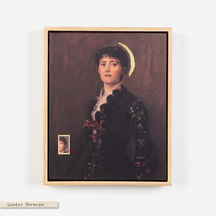 Quadro Canvas com moldura em madeira, colagem e detalhe em ouro.