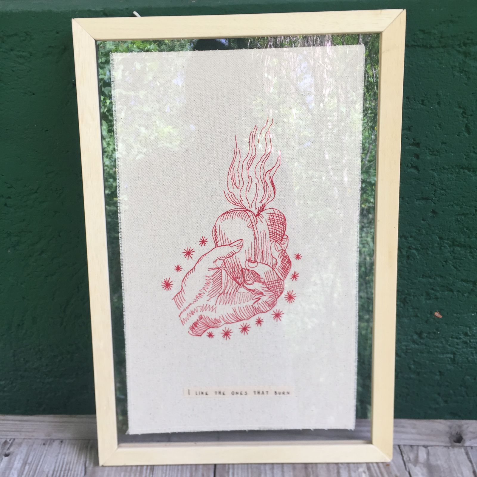 Ao redor do coração, pequenos detalhes bordados, como estrelas, acrescentam uma aura de espiritualidade e inspiração. Na base do tecido, a frase “I Like The Ones That Burn” (Eu gosto dos que ardem) complementa a obra com um toque poético e emocional.
