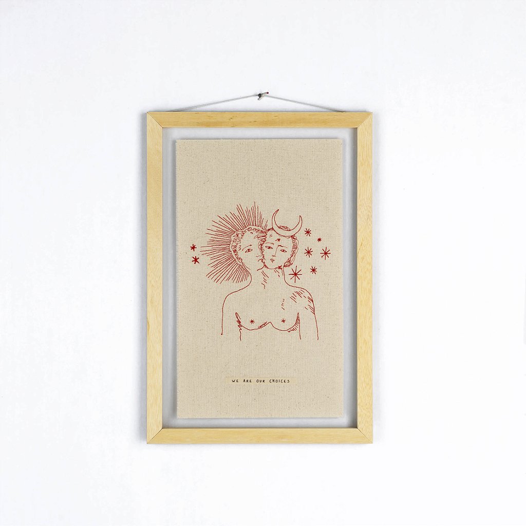 O Quadro Moldura Acrílico Duplo Bordado G - Lua e Sol é uma peça delicada e cheia de simbologia, representando a dualidade e equilíbrio entre luz e escuridão, masculinidade e feminilidade. Com bordado artesanal em vermelho vibrante, a ilustração apresenta figuras humanas unindo o Sol e a Lua, cercadas por estrelas, complementadas pela frase "We are our choices" (Somos nossas escolhas), trazendo profundidade e reflexão à peça.