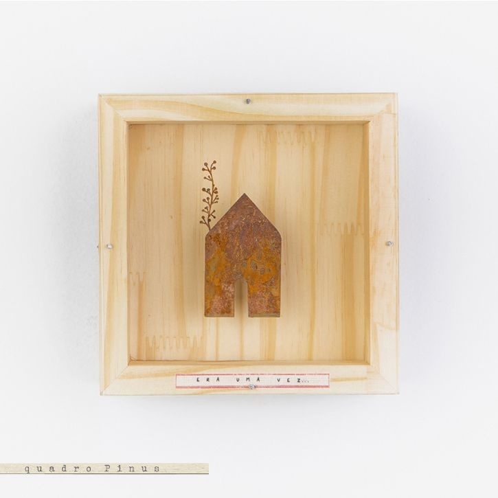 Quadro em madeira de reflorestamento com escultura em ferro e moldura de acrílico e frase na parte inferior.
