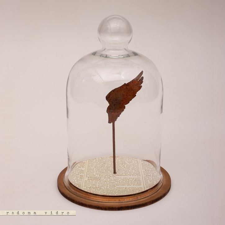 Redoma em vidro com escultura de ferro, base em MDF com papel antigo e borda de ouro.