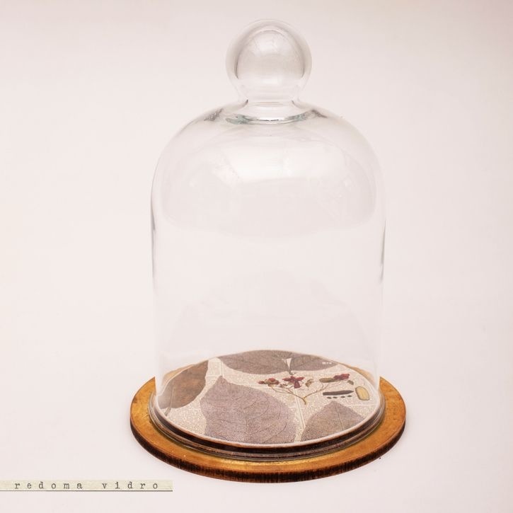 Redoma em vidro com escultura de ferro, base em MDF com papel antigo e borda de ouro.