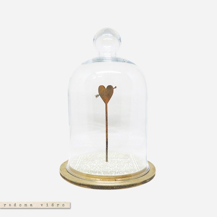 Redoma em vidro com escultura de ferro, base em MDF com papel antigo e borda de ouro.