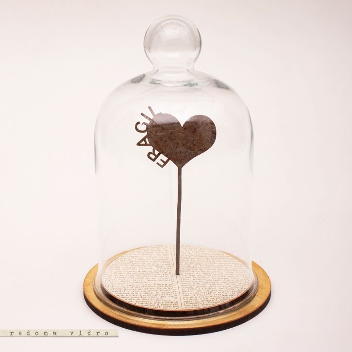 Redoma em vidro com escultura de ferro, base em MDF com papel antigo e borda de ouro.