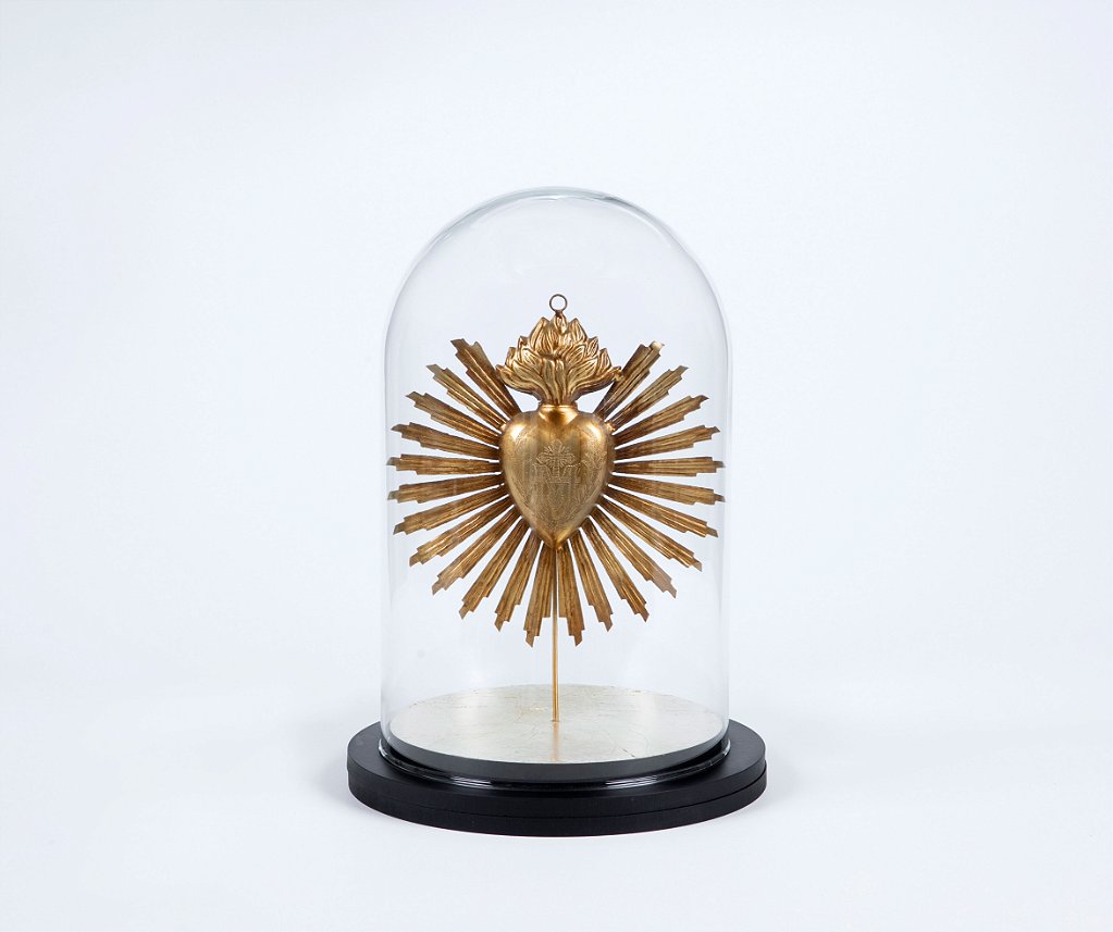 A Redoma Universo G - Sagrado Esplendor é uma peça artesanal extraordinária, que combina simbolismo e sofisticação para criar uma obra de arte única. Sob uma cúpula de vidro delicadamente trabalhada, encontra-se um coração sagrado dourado, cercado por raios que irradiam luz e espiritualidade. O coração flamejante simboliza amor, devoção e elevação espiritual, criando uma conexão poderosa com o sagrado.