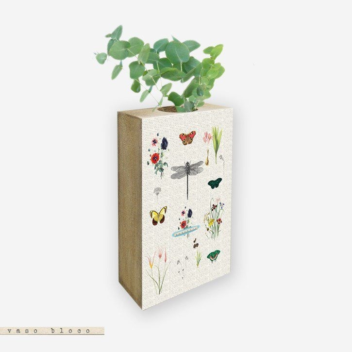 Vaso em MDF com um recipiente para colocar água e a sua flor preferida. Tem um furo na parte posterior e pode ser colocado na parede ou ficar apoiado.