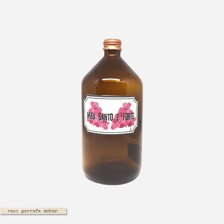 Garrafa de vidro com detalhe de pintura cobre e etiqueta de tecido.