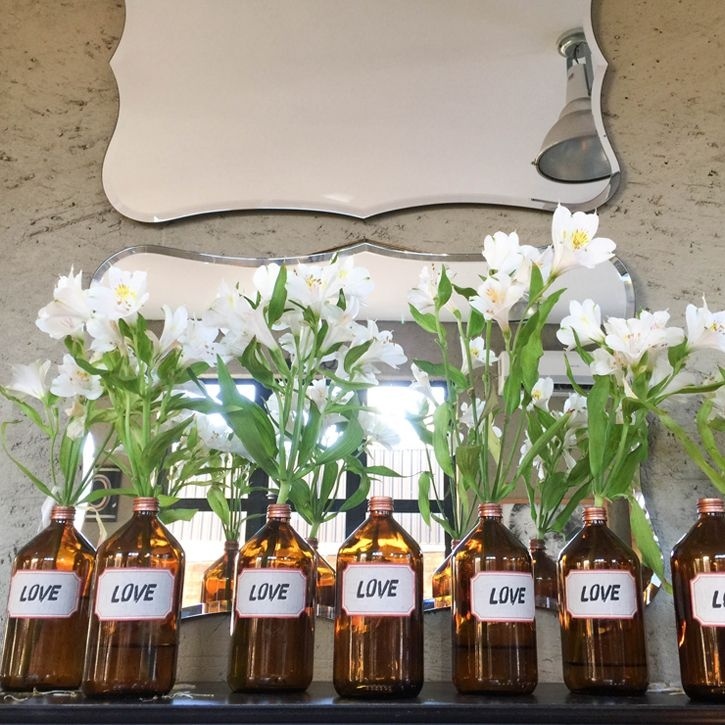 Garrafa de vidro com detalhe de pintura cobre e etiqueta de tecido.
